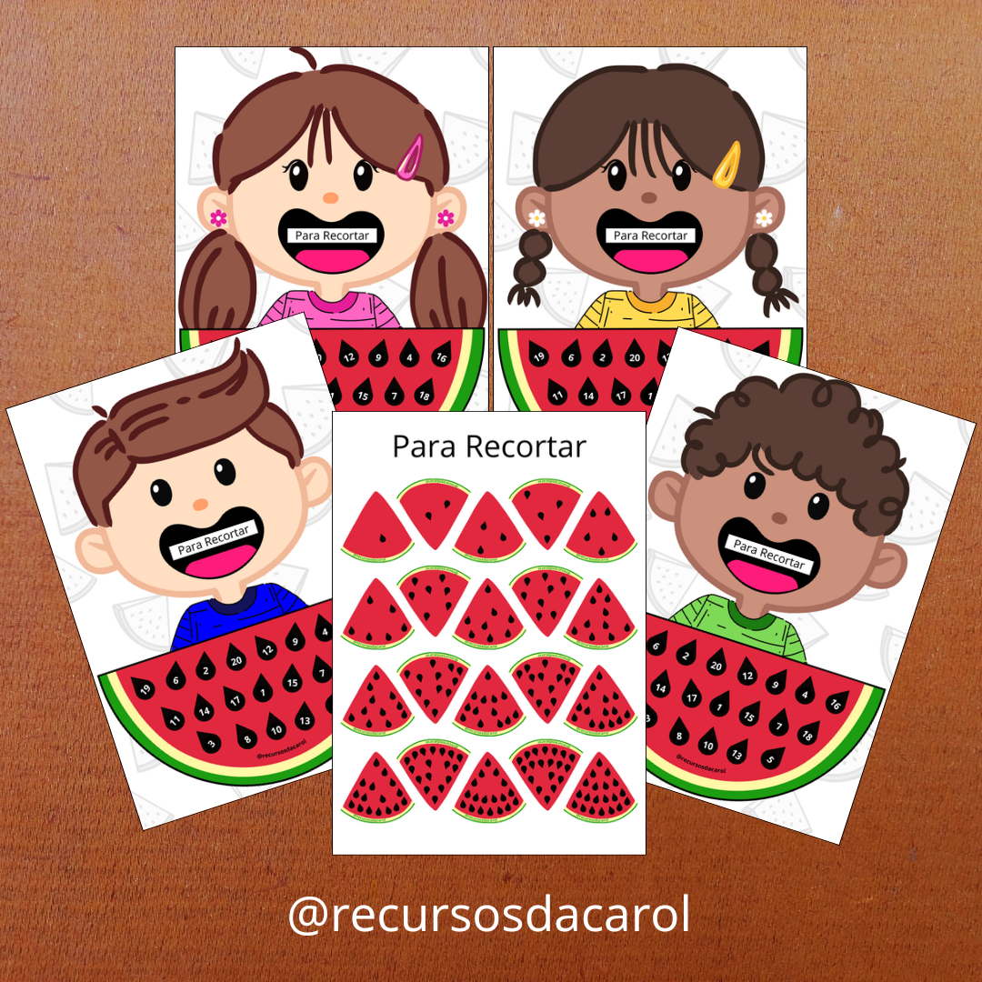 • 4 Pranchas com as melancias numéricas (Tamanho A4), cada uma delas apresenta uma criança, sendo duas com meninos e duas com meninas.